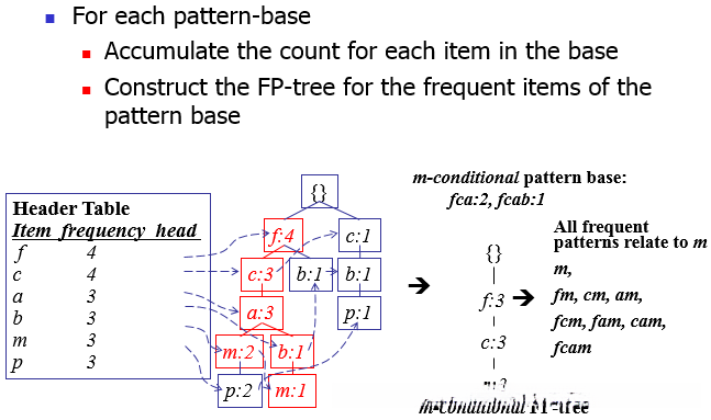 FP树挖掘: 由长度为1的频繁模式开始,构造它的条件模式基(由FP树与该后缀模式一起出现的前缀路径组成)进而生成条件FP树