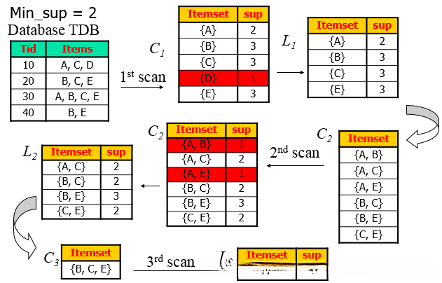 - 算法步骤: 首先,扫描数据库,累计单项的计数,找出满足最小支持度阀值的单项集,记为L1;然后,使用L1找出频繁2项集的集合L2,使用L2找L3......直到不能再找出频繁K项集。