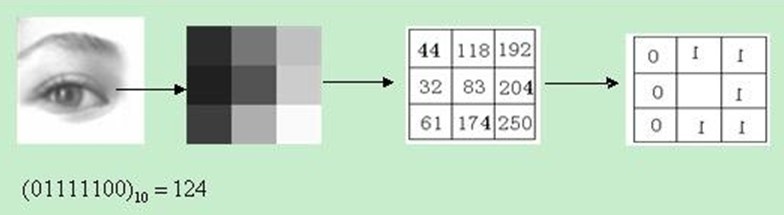 (2)对于每一个cell中的单素素点而言,在其周围的8个素索点处进行灰度值对比操作:如果所有周围各点的灰度均高于该中心素索点,则将其标记为1;否则标记为0。经过上述方式处理后即可得到该区域中心点对应的LBP特征码。