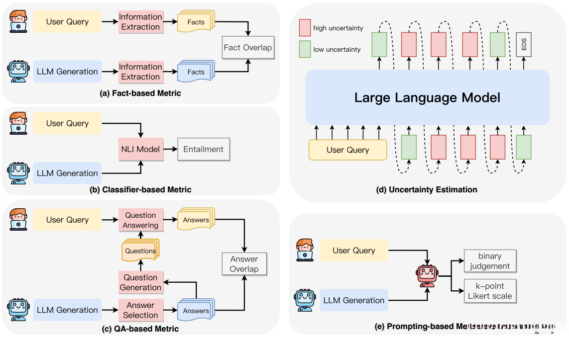 这种指标是通过捕获模型生成内容与其源内容之间的信息重叠。首先从LLM的输出中选择目标答案,然后由问题生成模块生成问题。接着,这些问题用于根据用户上下文生成源答案。最后,通过比较源答案和目标答案之间的匹配分数来计算LLM响应的真实性。尽管这些方法具有共同的主题方法,但在答案选择、问题生成和答案重叠等方面表现出变异性,导致不同的性能结果。在这一基础工作上,Fabbri等人对基于问答的指标中的组件进行了深入评估,从而进一步提高了真实性评估的效果。