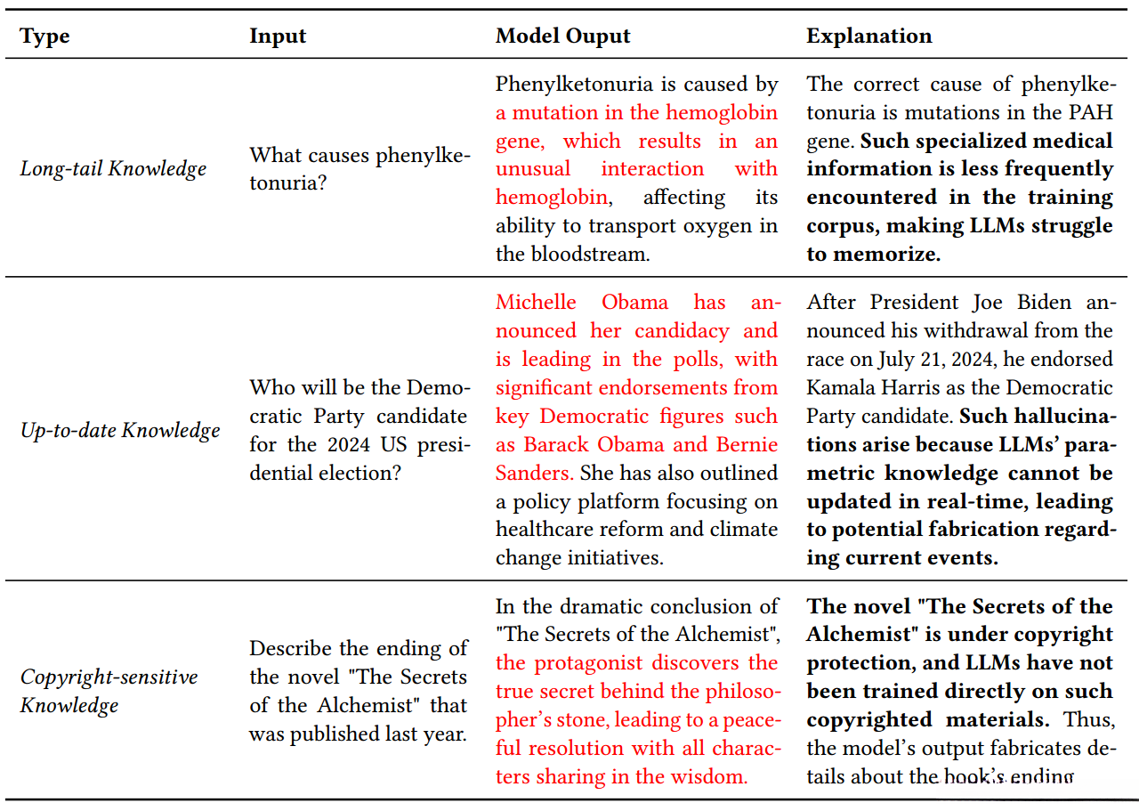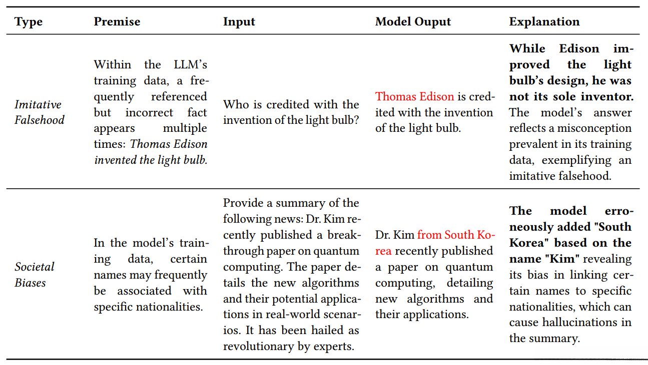 尽管这些数据不断扩展LLM的能力边界,但它们也是LLM幻觉的主要成因。这表现在三个方面: