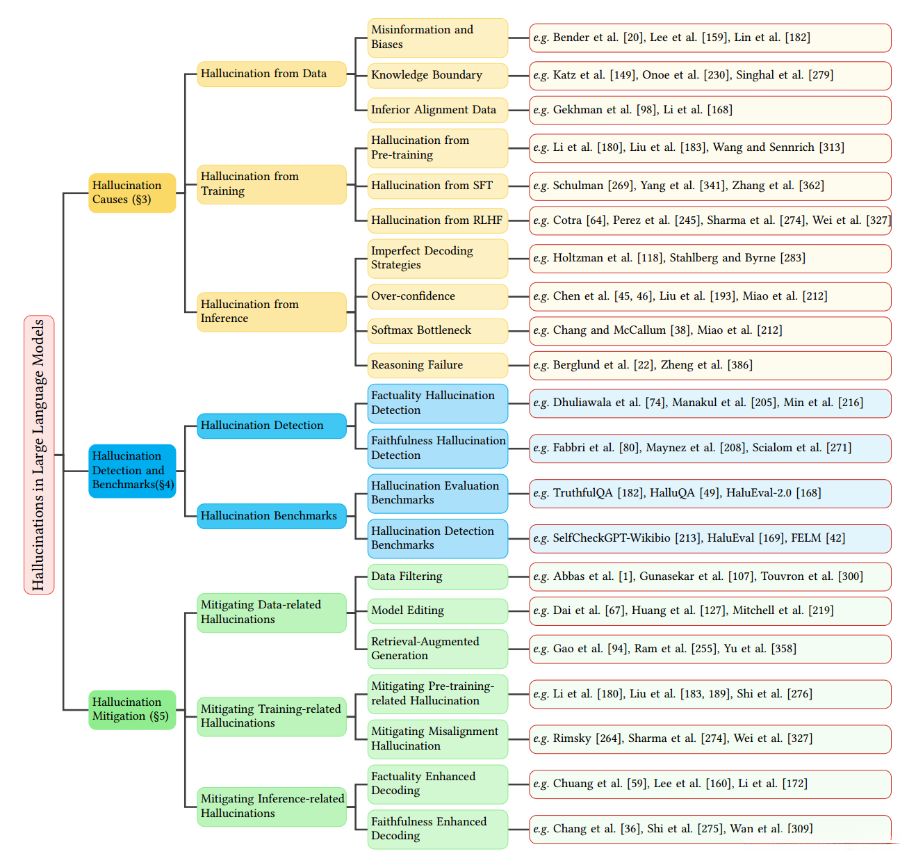 大语言模型容易产生幻觉,生成似是而非的内容。本文从大模型幻觉分类 开始,从数据相关、培训相关和推理相关 的角度,深入研究了导致幻觉的因素 ,随后全面概述了幻觉的检测方法和基准 。然后,讨论了减轻大模型幻觉的代表性方法 。最后,本文深入研究了当前RAG系统面临的幻觉问题,并为即将到来的研究描绘了潜在的途径。