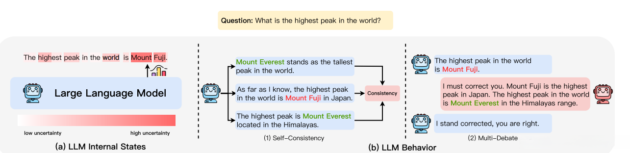 LLM的内部状态 :LLM的内部状态可以作为其不确定性的有用指标,通常通过标记概率或熵等指标表现出来。