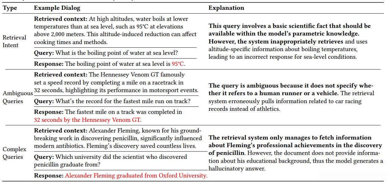 通过在推理过程中整合大规模的外部知识库,RAG可以减轻幻觉并提高LLM输出的真实性。尽管被设计用来减轻LLM幻觉,检索增强LLM仍然可以产生幻觉。在RAG中出现的幻觉相当复杂,表现为输出要么事实不准确,要么具有误导性。这种幻觉可能源于以下两个主要因素: