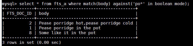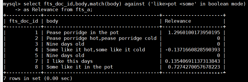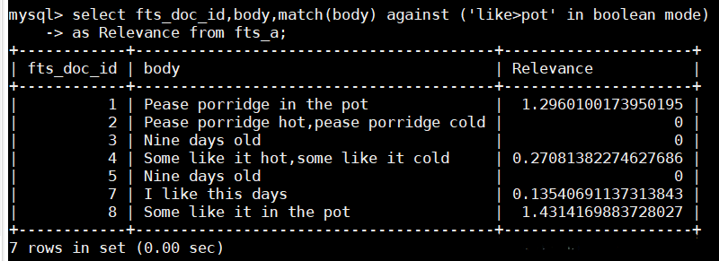 > 1. select fts_doc_id,body,match(body) against ('like>pot' in boolean mode)