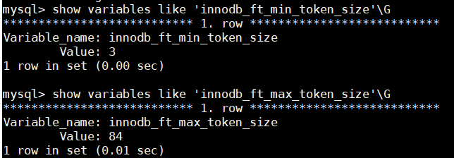 - 在InnoDB中,参数innodb_ft_min_token_size的默认值为3,参数innodb_ft_max_token_size的默认值为84