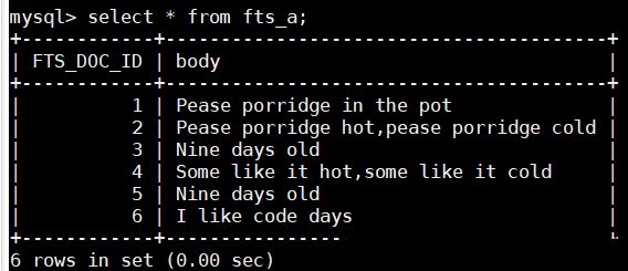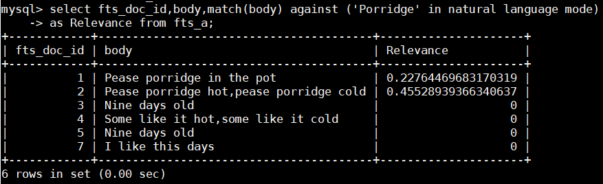> 1. select fts_doc_id,body,match(body) against ('Porridge' in natural language mode)