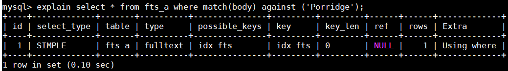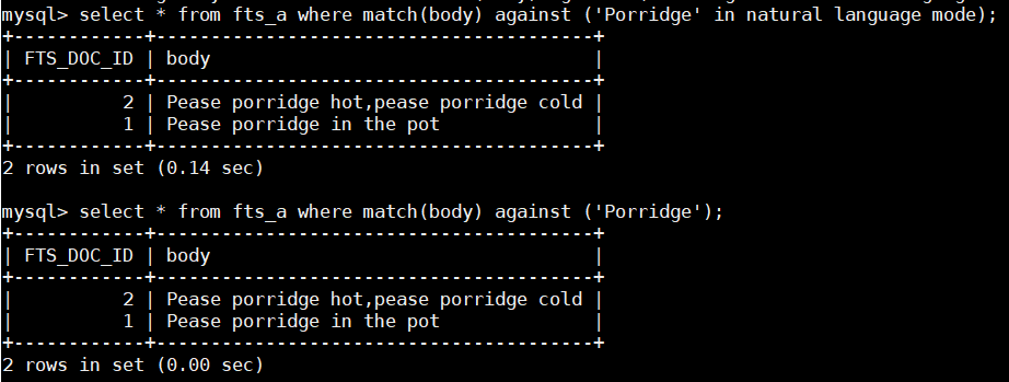 > 1. select * from fts_a where match(body) against ('Porridge' in natural language mode);