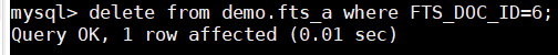 > delete from demo.fts_a where FTS_DOC_ID=6;