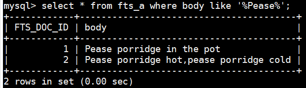 - 例如对上面创建的表fts_a,查询body字段中带有Pease的文档,**若不使用全文检索技术 ,**使用下述SQL语句来进行查询:
