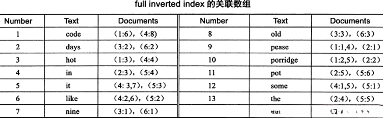 - **如果采用full inverted index的关联数组实现 ,**则其存储的内容如下表所示,可以看到: