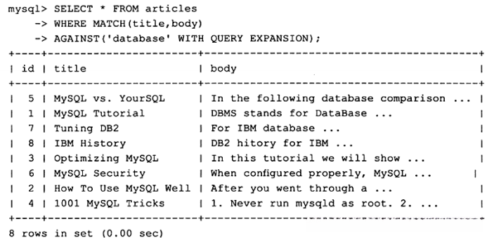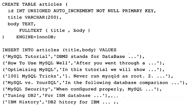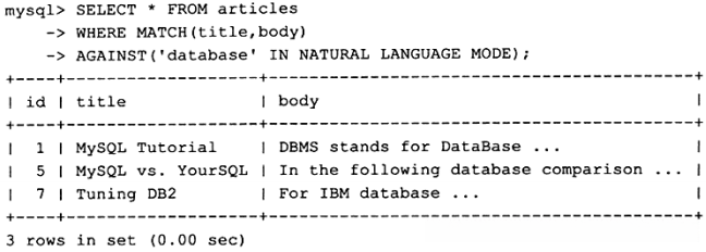 > 3. -- 由于NATURAL LANGUAGE MODE是默认的全文检索模式,因此用户可以简略为下述SQL语句