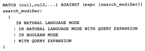 - 查询模式NATURAL LANGUAGE、BOOLEAN MODE、QUERY EXPANSION在下面介绍。