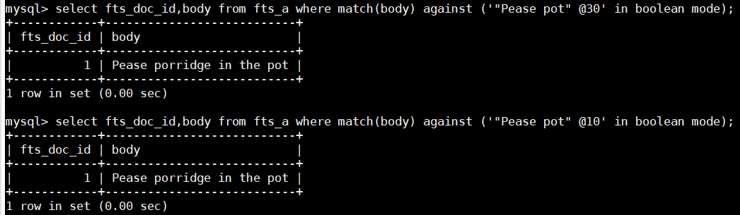 > 1. select fts_doc_id,body from fts_a where match(body) against ('"Pease pot" @30' in boolean mode);