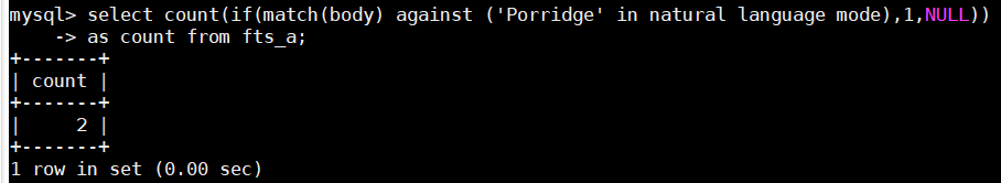 > 1. select count(if(match(body) against ('Porridge' in natural language mode),1,NULL))