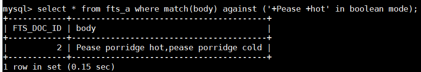 > select * from fts_a where match(body) against ('+Pease +hot' in boolean mode);