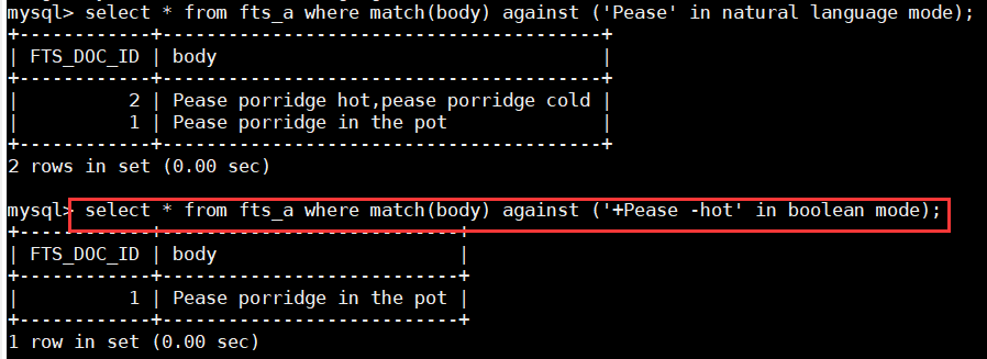 > 1. select * from fts_a where match(body) against ('like hot' in boolean mode);