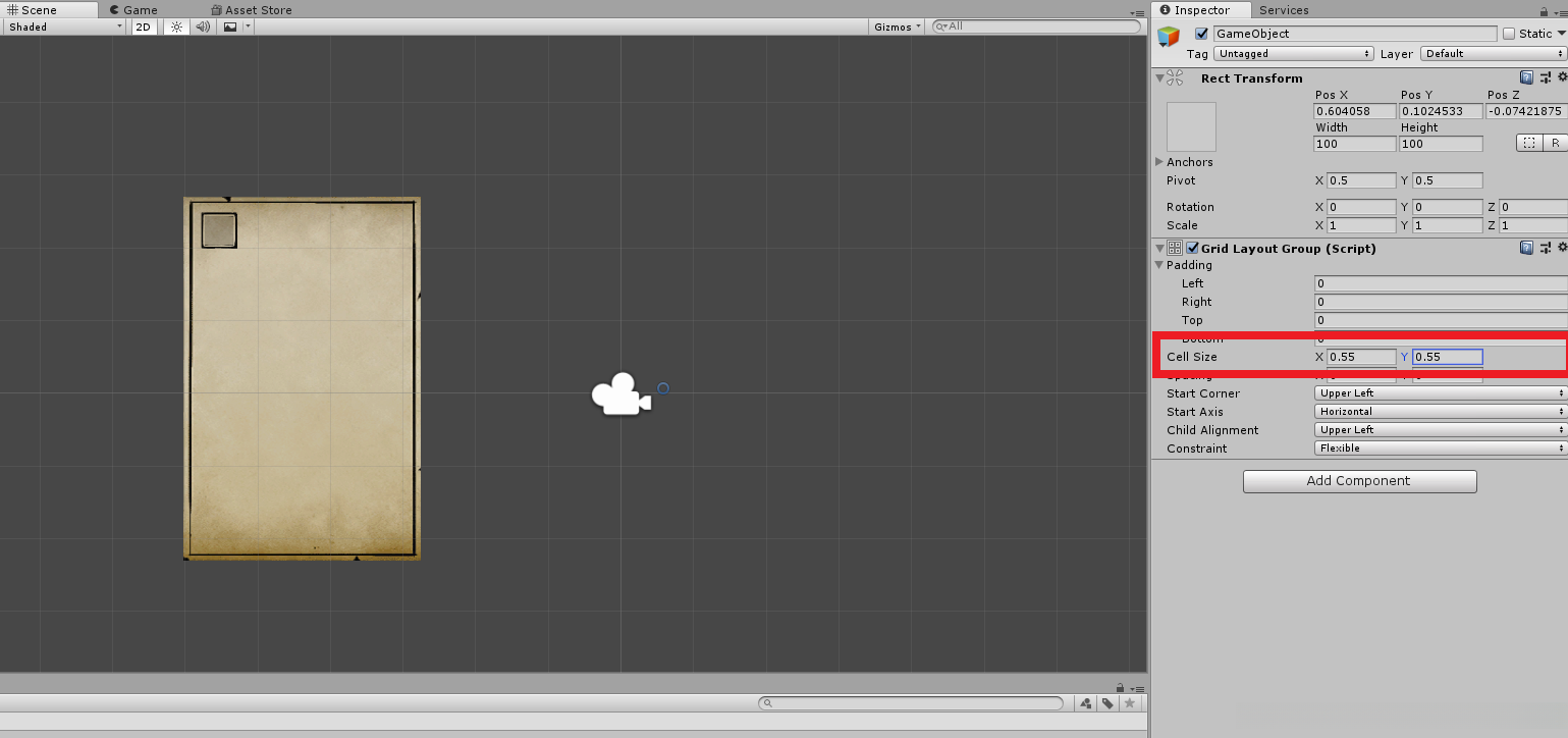 4. 把格子object拖拽到GameObject旗下,使其成为子类,同时给GameObject添加Component: Grid Layout Groupd, 调整参数cell size 为格子的大小