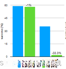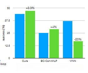 当对脚本数据进行训练时,CVAE目标的去除几乎不会对性能产生影响,因为数据集是完全确定的。而人类数据则从35.3%大幅下降到2%。这说明CVAE目标在从人类演示中学习时至关重要。