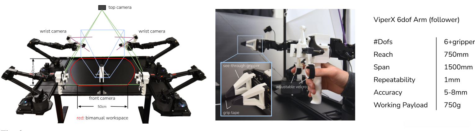 我们的工作转向低成本的硬件,并试图使它们能够执行高精度、闭环的任务;遥操作设置使用了领导者和追随者机器人 the leader and follower 之间的关节空间映射 joint-space mapping