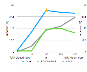 - 将K=2000 400时的轻微下降(即接近开环控制)归因于缺乏反应行为和难以对长动作序列建模。the lack of reactive behavior and the difficulty in modeling long action sequences