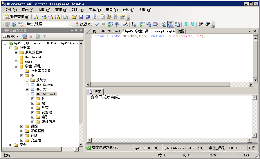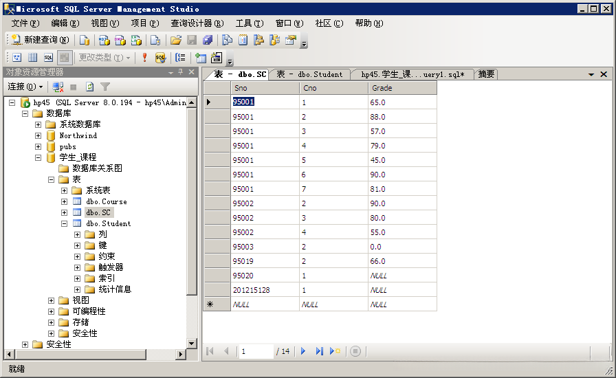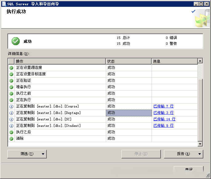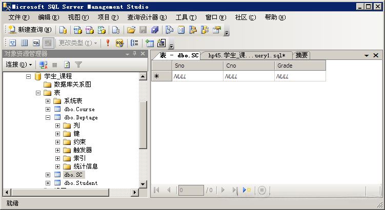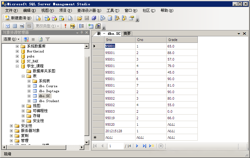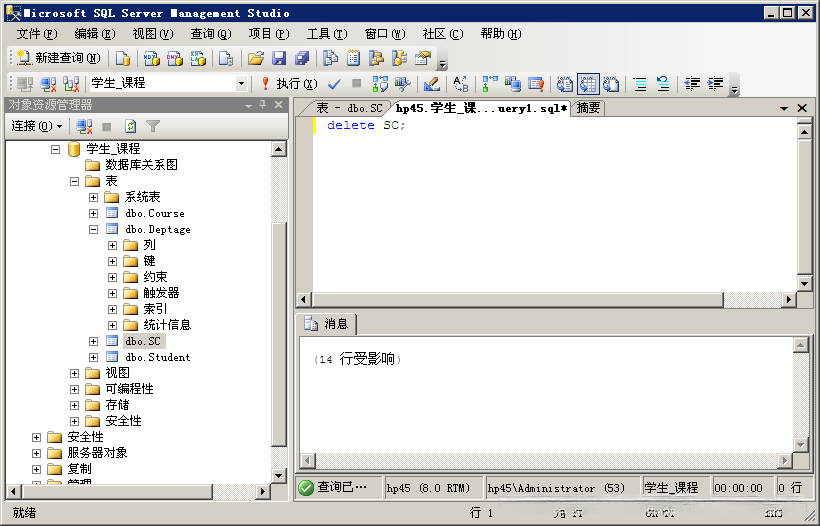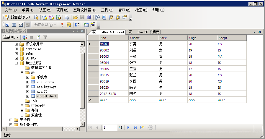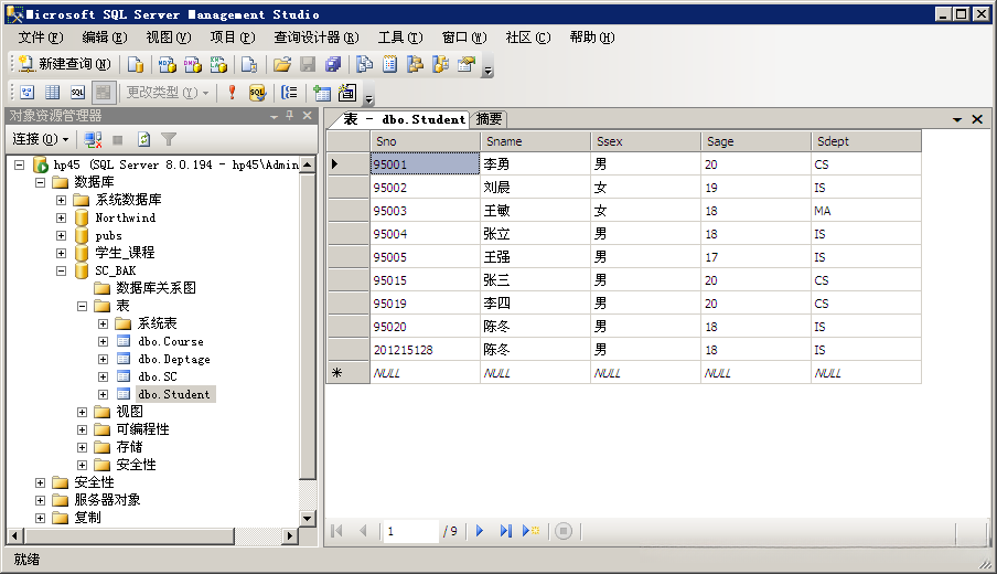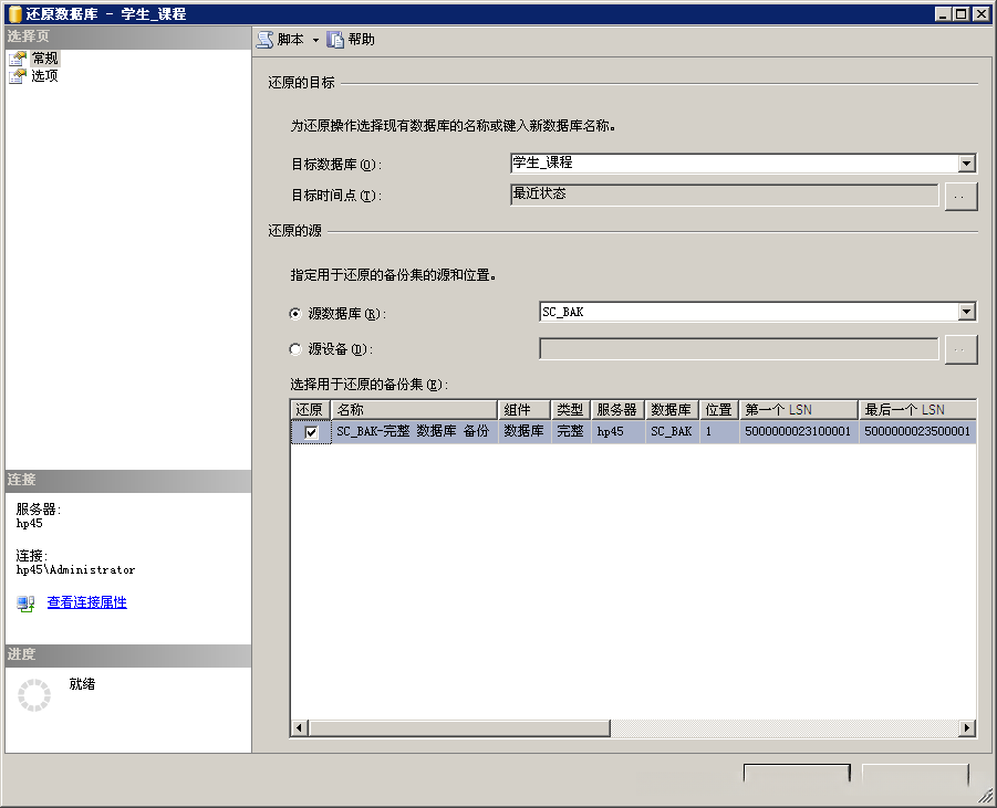 - 利用步骤(3)建立的数据库“SC_BAK”,恢复“学生-课程”数据库中所有表的结构及数据;