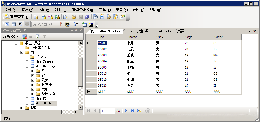 将一个新学生记录(学号:95020;姓名:陈冬;性别:男;所在系:IS;年龄:18岁)插入到Student表中;