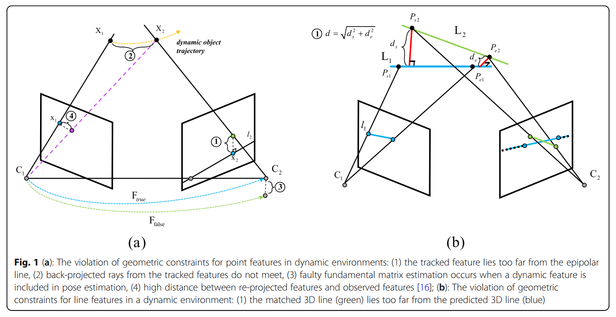 低级特征主要包含点类型的特征与线类型的特征。点类型的特征在纹理场景中的视觉定位与建模方面得到了广泛应用 ,以其卓越性能为基础构建了高效的定位模型与三维重建算法 。**近期研究表明 ,通过有效地结合使用点类型与线类型相结合的方式能够实现更加鲁棒的空间定位与建模技术 。因此 ,本文重点探讨如何在动态环境下实现高效的SLAM技术