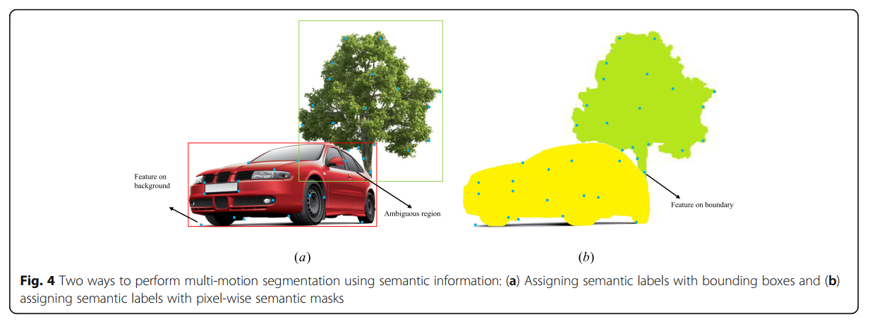 与直接将聚类算法作用于低级特征相比,在处理高级特征求取地图点聚类方面更具优势。这种高级特性不仅有助于对具有不同动态特性的独立对象进行地图点聚类,并且还能够显著提升在单次观测中检测动态对象的能力[100]。对于刚体物体而言,具有相同语义标签的所有特征始终具备一致的运动标签[47]。根据图4a所示,在图示场景中边界框不仅包含了物体本身还涵盖了背景区域。值得注意的是,在两个边界框覆盖区域重叠的情况下会出现模糊情况(如图4b所示)。为了准确识别位于物体表面的真实特征点,必须依赖几何信息(例如轨迹或深度信息)来进行精确匹配[47]。相比之下,在实际应用中基于语义掩模的方法通常更为简便易行:一旦某一点落入语义掩模所定义的区域内,则可以直接归类到对应的物体内;而如果该采样点位于边界的边缘区域,则可能会影响后续轨迹估计和结构重建过程[47]