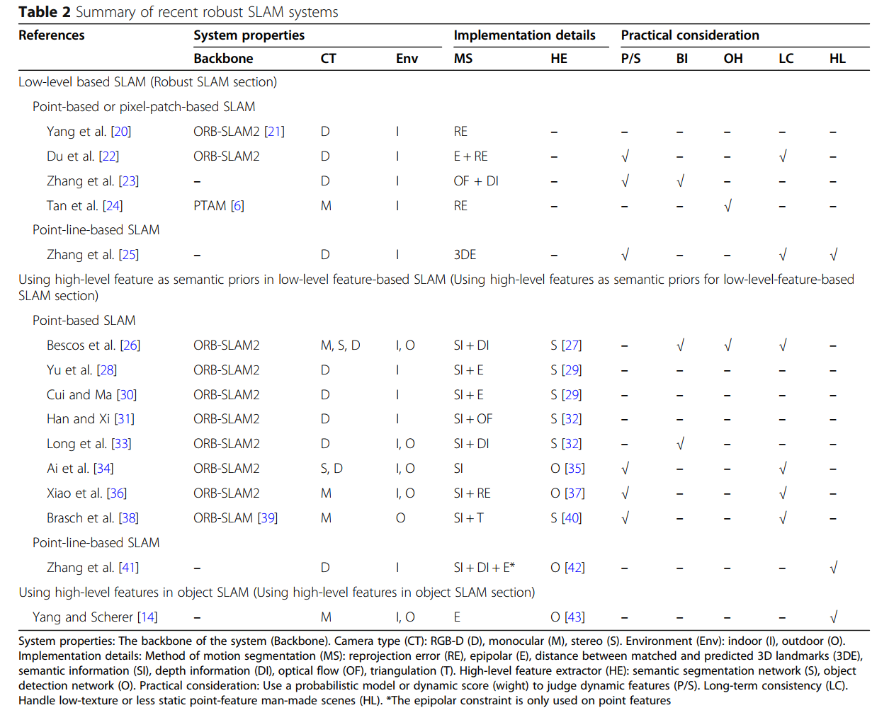 表2简要概述了最近发展的鲁棒SLAM系统。该系统面临诸多挑战,在准确识别动态元素的同时还需有效应对遮挡问题,并需持续维护地图的一致性,在剔除动态特征时必须谨慎处理有限数量的有效点特征。详细阐述上述内容将在鲁棒SLAM部分展开,并在该部分的讨论中对比分析低级与高级特征的表现。
