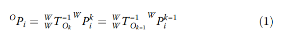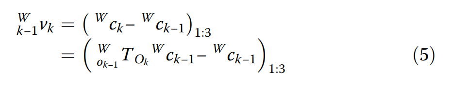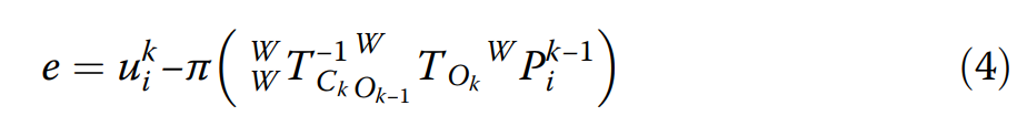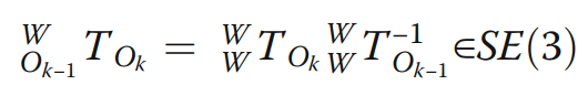 描述了从k-1时刻到k时刻的姿态变化(如图所示,在世界坐标系W中)。这代表了一个物体的运动(而不考虑其姿态)。从而推导出一个新的重投影误差。(如下所示:)