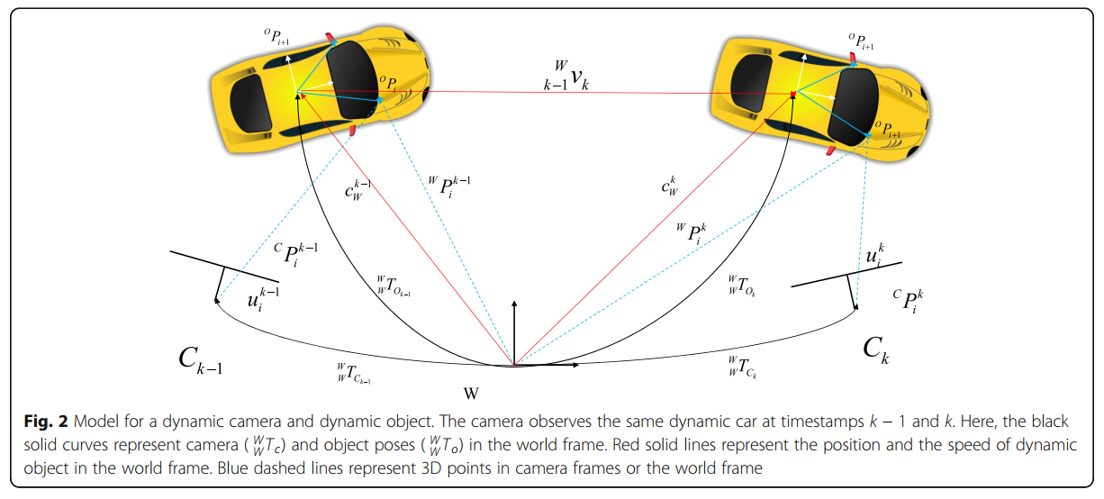 对于具有动态特性的立体相机或RGB-D相机系统,在每一帧图像中都能够捕获到动态点位的空间深度信息因此能够较为精确地估算出刚体物体的姿态变化与传统的静态场景下基于单一框架的标准SLAM方法不同B escos等研究者[48]提出了一种新型的方法他们通过构建一个紧密耦合的多目标跟踪与SLAM系统的框架实现了对动态环境中的目标追踪与空间重构这种方法避免了传统SLAM仅针对静止场景的特点而更具适应性Zhang等学者[51]以及Henein等团队[82]则将公式(4)中的新引入因子纳入到静态SLAM的因素图中并通过这种方法直接计算出刚体物体的姿态变化而不依赖于物体的姿态信息同样Wang等研究者[44]也采用了基于立体相机的方法具体而言他们以相机坐标系中的点坐标为基础构建了空间定位模型并无需依赖世界坐标系的信息进而计算出相机相对于各目标之间的相对运动状态随后通过将各 camera 的运动参数及其相对于移动物体 camera 的逆变换相乘的方式实现了整体的目标姿态估计