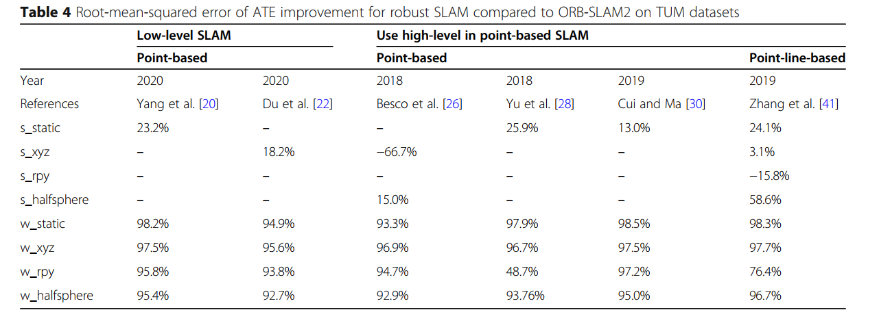讨论:表4列出了基于RGB-D相机的一些系统相对于ORB-SLAM2的性能提升情况。其中的数据全部源自相关文献。研究者引用文献[92]中的绝对轨迹均方根误差作为性能评估指标进行比较分析。这些系统在TUM RGB-D室内数据集[92]中的两类序列上进行了测试分析:一类是坐姿(s)序列,在这类场景下仅包含两名静止站立的人;另一类是行走(w)序列,在这类动态场景中有多名移动的人参与测试。