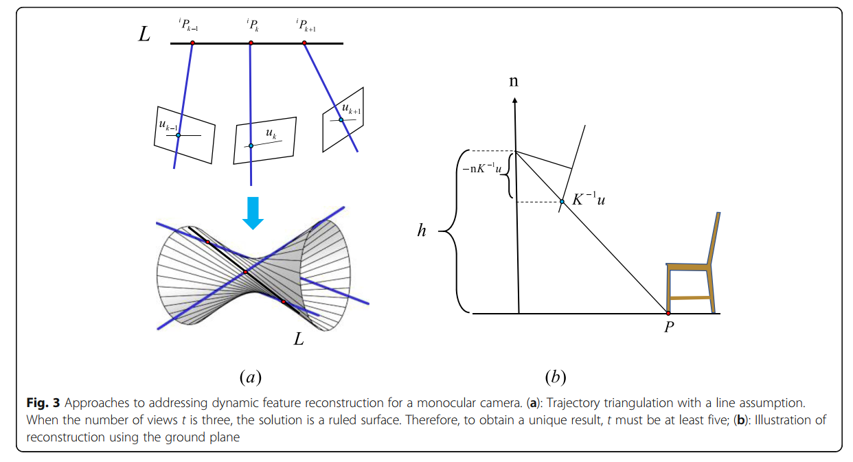对于单目相机来说,在这一过程(即重建与追踪)中面临两大主要挑战。首先,在处理动态特征时(即那些位置或形状发生变化的对象),标准三角测量不可行(即无法实现)。其次,在估算运动物体的轨迹时会遇到模糊性问题;这种模糊性表现为一系列相对于相机运动轨迹的单参数曲线族难以精确恢复[83, 84]。