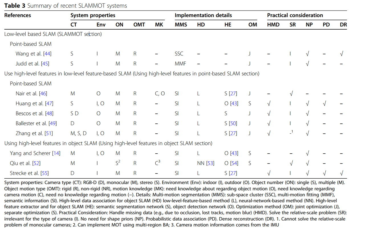 表3是对最近一些SLAM MOT系统进行了简洁总结。