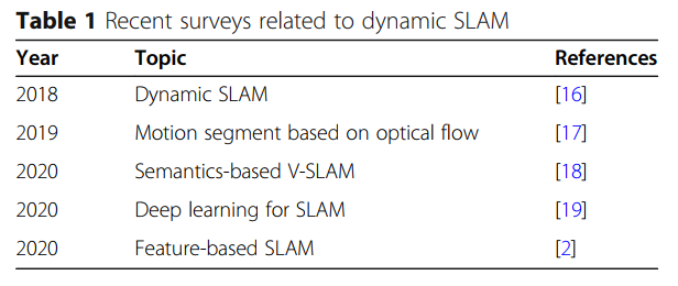 本文对动态SLAM领域的最新综述进行了总结。如表1所示的数据集展示了相关研究的关键指标对比分析结果。Xia等人[18]对基于语义的信息融合视觉 SLAM方法进行了深入研究,并提出了改进方案以提升定位精度。Chen等人[19]则探讨了深度学习技术在 SLAM系统中的应用前景,并提出了一种结合多传感器数据的新框架以提高系统的鲁棒性。Saputra等人[16]系统性地分析了动态 SLAM面临的三大关键挑战,并将其划分为鲁棒的视觉 SLAM、基于运动分割和三维重建的方法三类。近年来关于特征驱动的 SLAM方法的一篇综述论文中指出,在实际应用中特征提取算法的选择直接影响着整体性能表现。此外,在这篇综述的基础上本文还进一步探讨了Saputra等人的开创性工作以及Azzam等人的创新成果在动态 SLAM领域的整合与进展