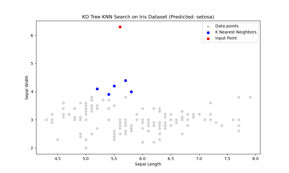 最近邻确定 :继续回溯和检查,直到根节点。此时的最近邻候选即为最终的最近邻。