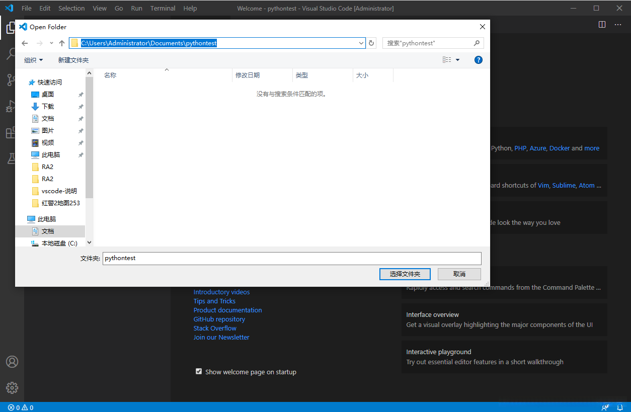 在对话框中找到C:\Users\Administrator\Documents\python\pythontest 目录,点击“选择文件夹”完成Vscode目录选择。