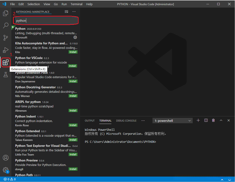 ( 鼠标悬停后显示:Extensions(Ctrl+Shift+X) ) - 在“EXTENSIONS:MARKETPLACE”文字标签下,输入"python"(只输入双引号内的python单词)。