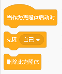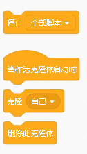 【克隆】 是比较重要的积木块,在游戏中,我们会经常用到它。这里我们只做一个简单的介绍,后续我们会着重讲解。