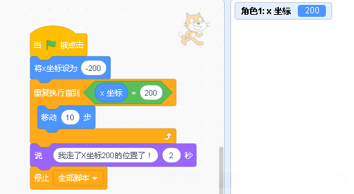 举个例子:小猫一直朝前行走,直到走到X坐标为200时,则停下脚步,如下图: