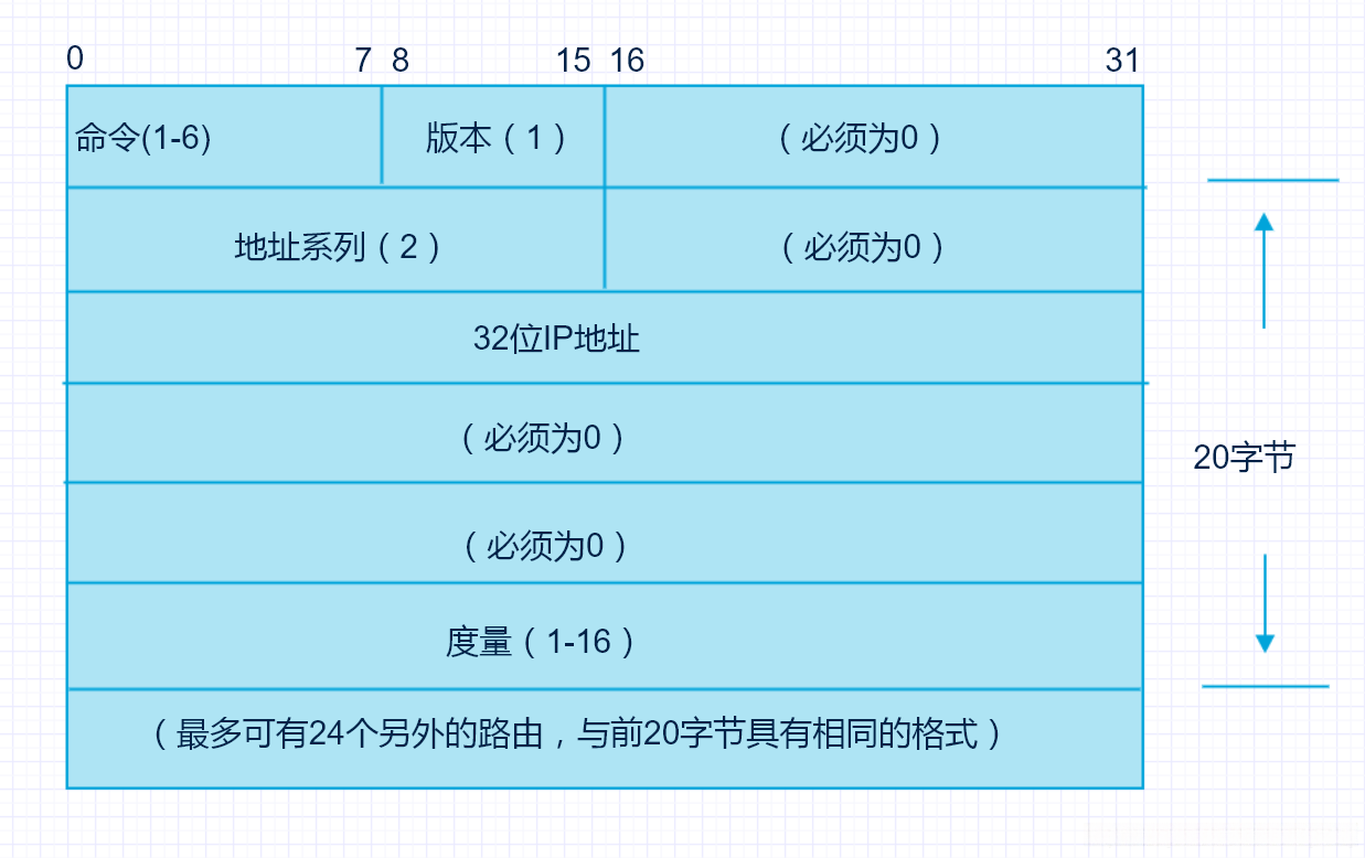 采用这种20字节格式的RIP报文可以通告多达25条路由,为保证20 * 25 + 4 = 504 小于512字节。(RIP是一个基于UDP协议的,并且RIP-1(版本1)的数据包不能超过512字节。)