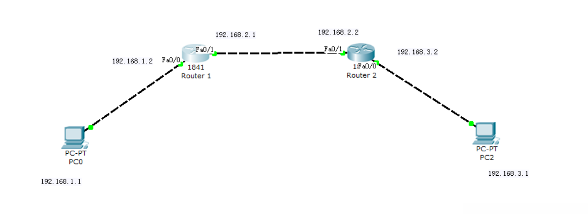 Router 1 和192.168.3.0 网不是直接相连的,需要配置静态路由,同理,Router 2 和 192.168.1.0 网不是直接相连的,需要配置静态路由。