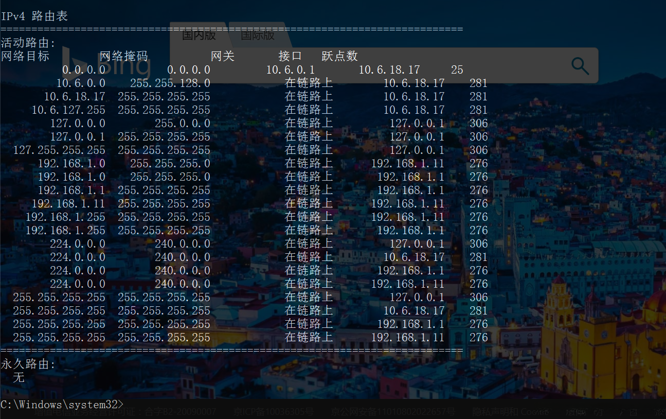 我们在命令行中使用 route print -4 命令打印路由表,结果如下: