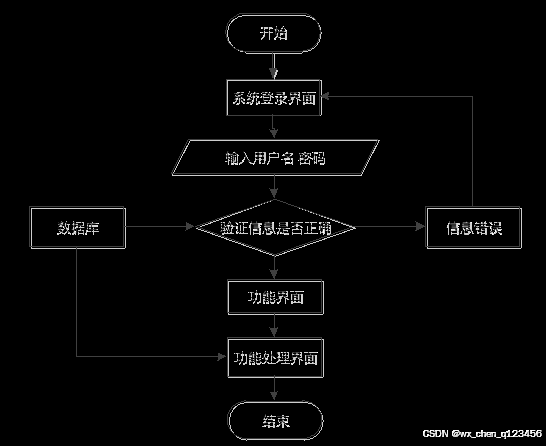 由系统将程序分配给用户进行操作时,则必须呈现其相应的工作流程图(如图3.1所示),以便能让用户轻松掌握其基本运行流程。目前而言, 各类程序的操作规范基本上遵循以下统一流程:首先通过登录页面输入必要的账号信息, 然后等待系统验证, 验证成功后即可进入功能操作界面后依次执行相应的操作步骤