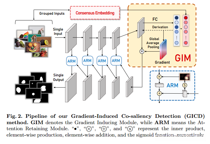 我们提出了一个用于Co-SOD的梯度诱导共显著性检测(GICD)网络。具体而言,我们提出了一个梯度诱导模块(GIM)来关注判别共同显著性特征,以及一个注意保持模块(ARM)来保持自顶向下解码过程中的注意。