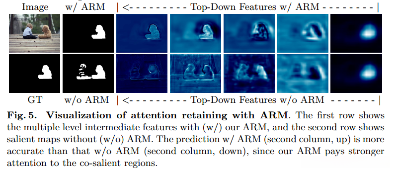 如图2所示,对于每个ARM,用于跳接的编码器的特征都是由更高层次的 prediction 来引导的。通过自顶向下的迭代提醒,在不受其他无关物体干扰的情况下,网络将重点放在协同显著区域的细节恢复上。