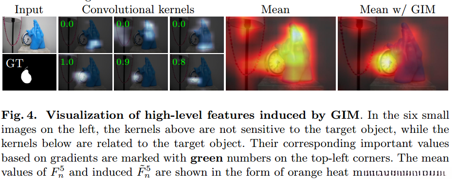 如图4所示,如果没有我们的GIM模块,核将平均关注这两个对象。可以看到,与共同显著性类别越相关的核具有越高的梯度权重(用绿色数字标记),梯度诱导后,网络的注意力转移到共同显著性对象上。
