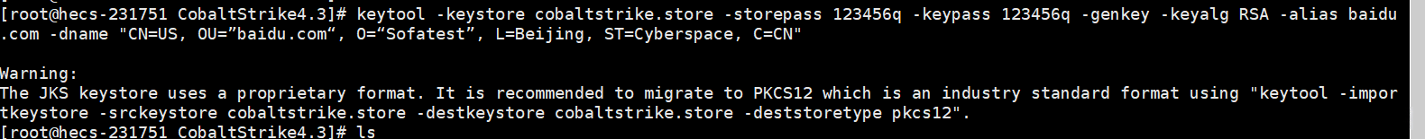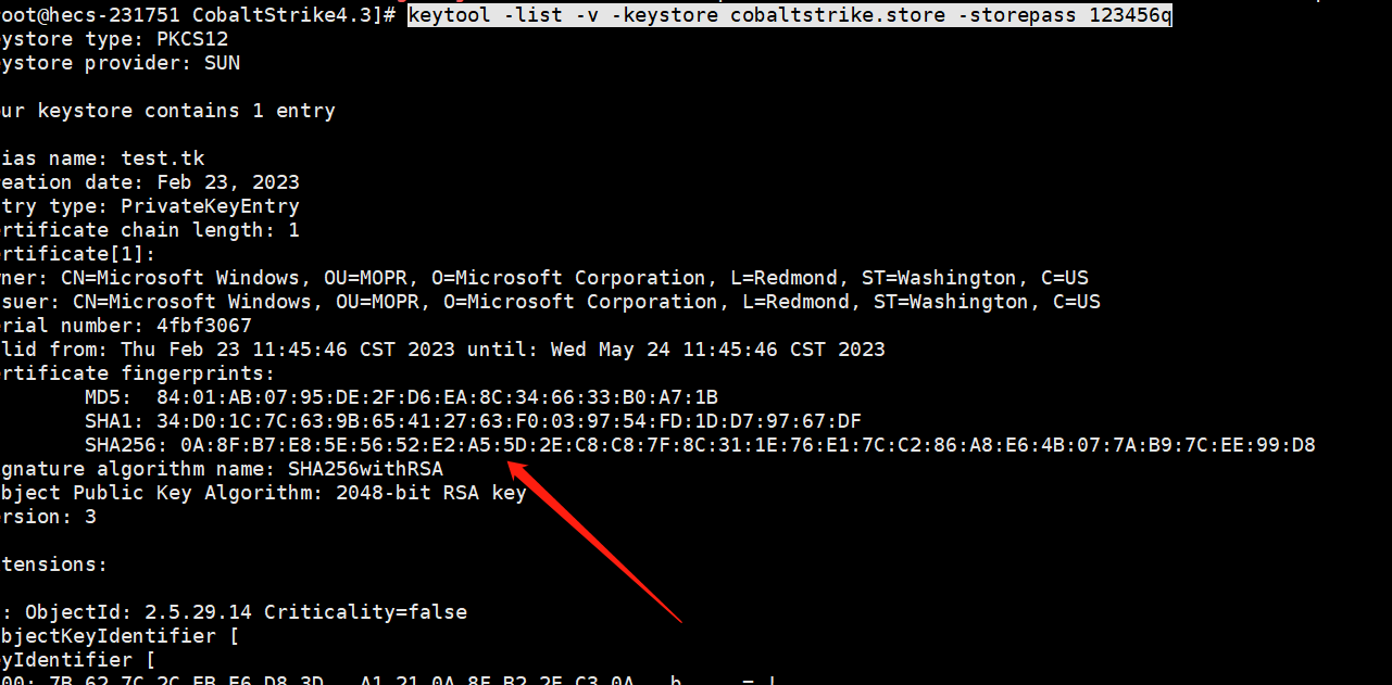 keytool -list -v -keystore cobaltstrike.store -storepass xingshen