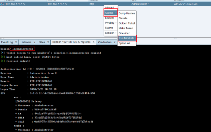 想获取当前用户的密码信息可以通过执行mimikatt工具完成;双击鼠标右键管理员权限会话选择Access选项,并在其下拉菜单中选择Run Mimikatt;或者通过控制台输入logonpasswords命令。